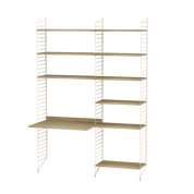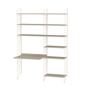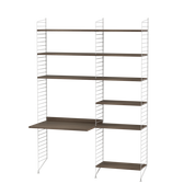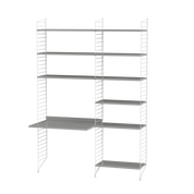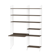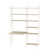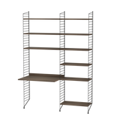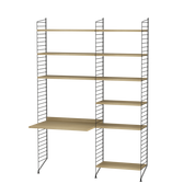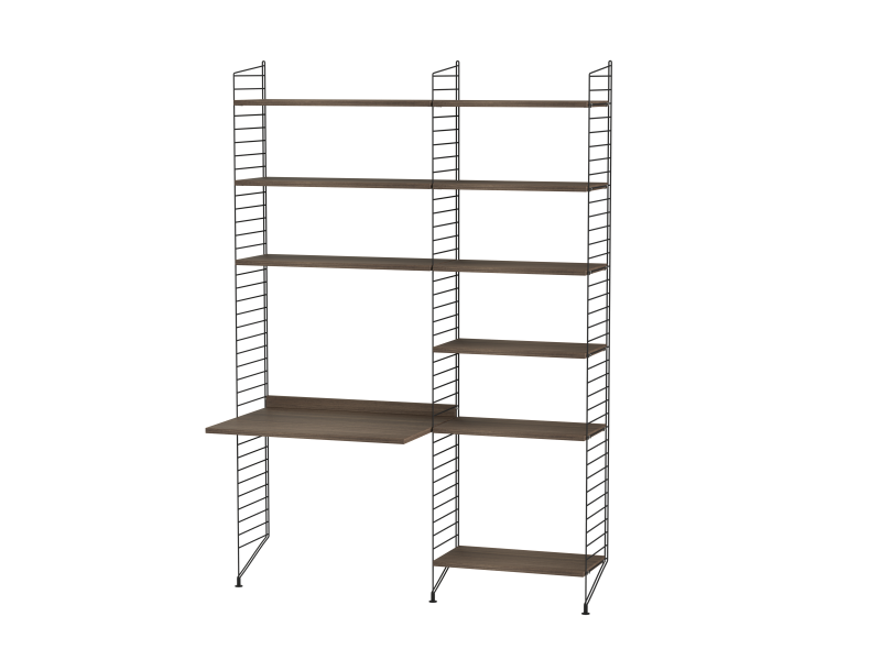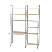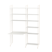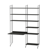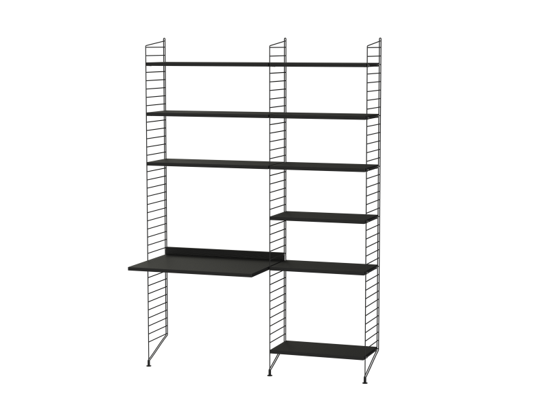 Ici, String propose une solution pour ranger les affaires de vos enfants. Elle permet de ranger aisément toutes les peluches, figurines et poupées de vos enfants. La section composée du bureau lui donne ainsi un espace de travail. Les étagères hautes de cette section permettent de ranger ses crayons, ses livres, feuilles etc. Son design sombre et élément permet de suivre votre enfant dans son évolution.