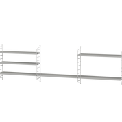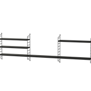 La gamme String s’est enrichie au fil des années: les tablettes et montants métalliques ont été déclinés en divers coloris et équipés de nouveaux accessoires (porte-journaux, tables pliantes, cabinets aux portes coulissantes, étagères avec récipients ou plateaux de bureau).
