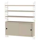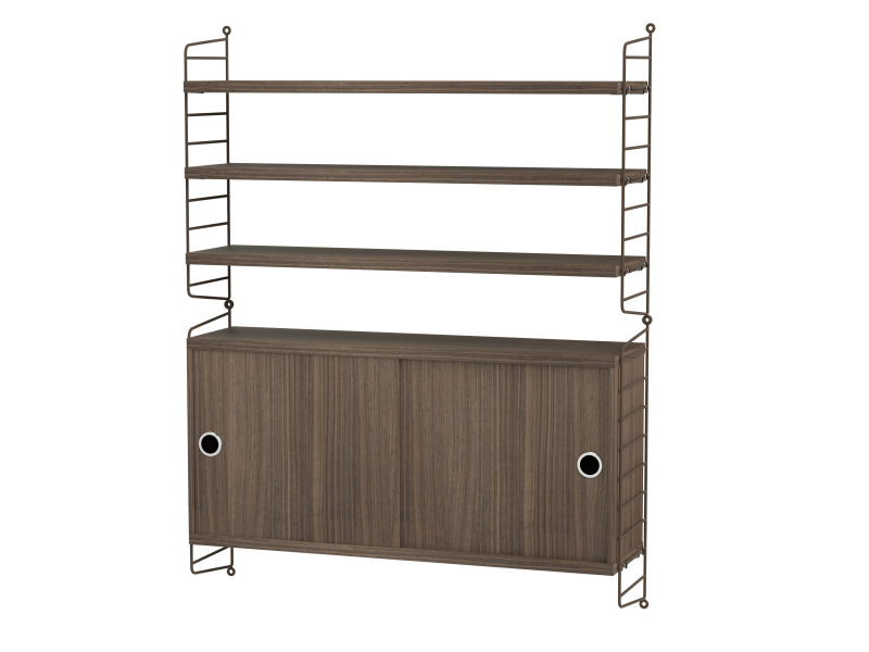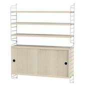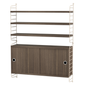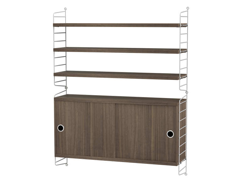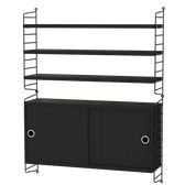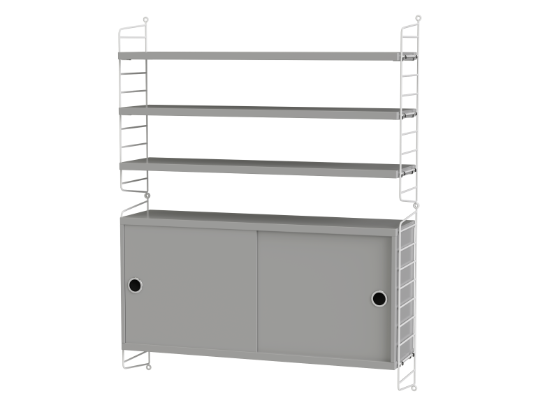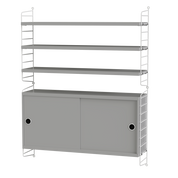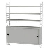 La gamme String s’est enrichie au fil des années: les tablettes et montants métalliques ont été déclinés en divers coloris et équipés de nouveaux accessoires (porte-journaux, tables pliantes, cabinets aux portes coulissantes, étagères avec récipients ou plateaux de bureau).