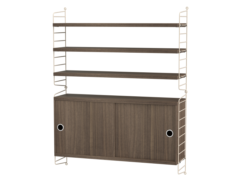 Le système STRING est composé de deux montants en métal (beige, blanc, gris, noir ou métal) sur lesquels il suffit d’insérer des tablettes en bois (beige, blanc, gris, frêne teinté noir, frêne, chêne ou noyer).
