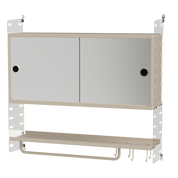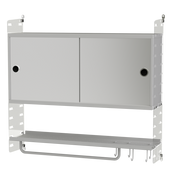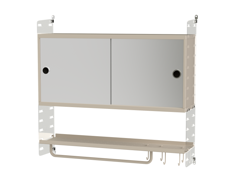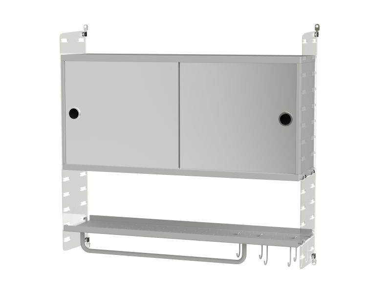 String vous propose ici un module créé pour la salle de bain. Il est à fixer au mur et se compose d’un caisson afin de ranger vos produits de beauté, crème, maquillage ou encore vos parfums. Le rail et les crochets vous permettent de suspendre vos articles de toilette. Les portes miroir lui permettent de s’intégrer parfaitement dans votre salle de bain. Le design sobre et élégant s’adapte aisément à votre intérieur. Le meuble semble en lévitation grâce aux montants en plexiglas.