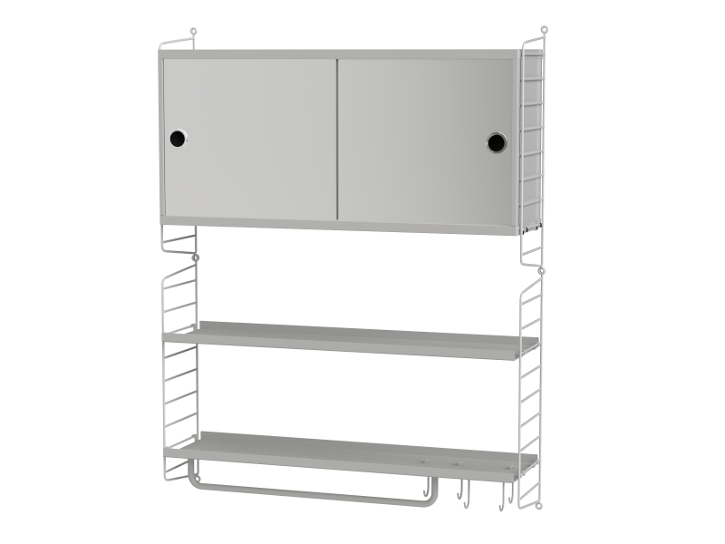 La gamme String s’est enrichie au fil des années: les tablettes et montants métalliques ont été déclinés en divers coloris et équipés de nouveaux accessoires (porte-journaux, tables pliantes, cabinets aux portes coulissantes, étagères avec récipients ou plateaux de bureau).