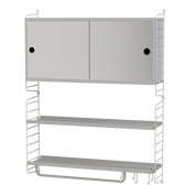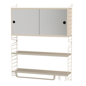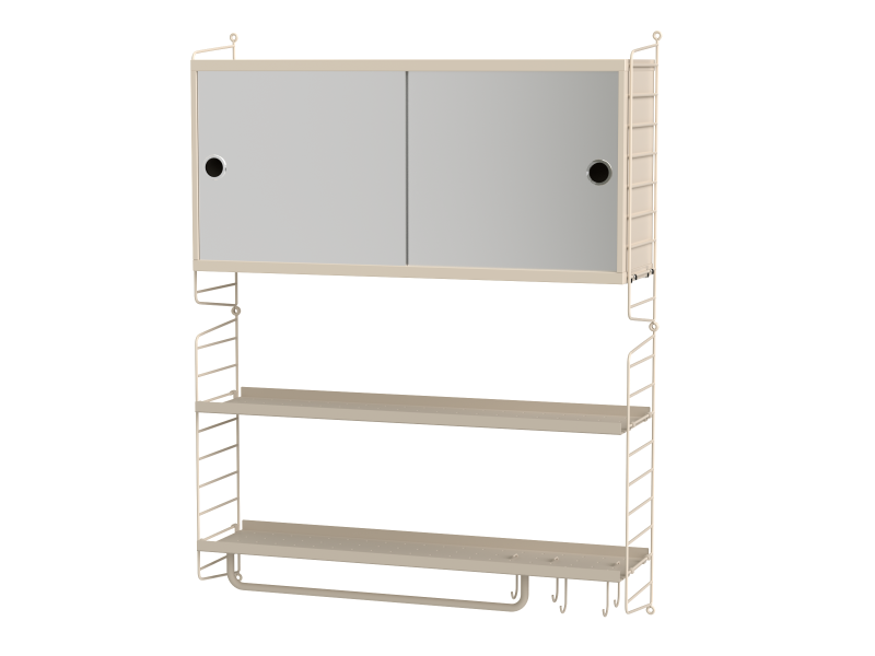 String vous propose ici un module créé pour la salle de bain. Il est à fixer au mur et se compose d’un caisson afin de ranger vos produits de beauté, crème, maquillage ou encore vos parfums. Le rail et les crochets vous permettent de suspendre vos articles de toilette. Les portes miroir lui permettent de s’intégrer parfaitement dans votre salle de bain. Le design sobre et élégant s’adapte aisément à votre intérieur.