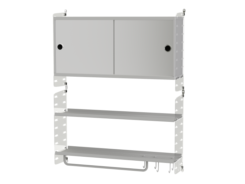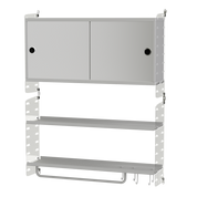 String vous propose ici un module créé pour la salle de bain. Il est à fixer au mur et se compose d’un caisson afin de ranger vos produits de beauté, crème, maquillage ou encore vos parfums. Le rail et les crochets vous permettent de suspendre vos articles de toilette. Les portes miroir lui permettent de s’intégrer parfaitement dans votre salle de bain. Le design sobre et élégant s’adapte aisément à votre intérieur.