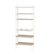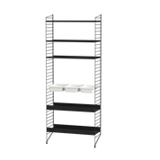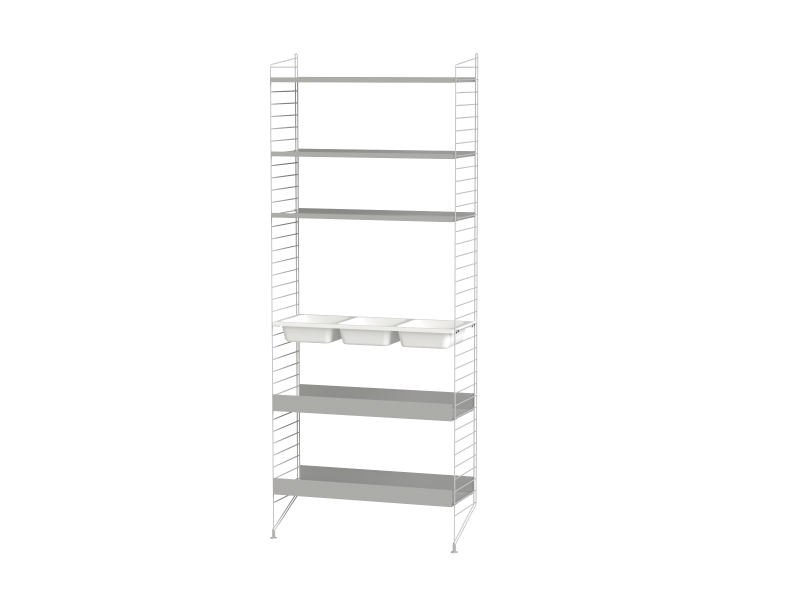 La gamme String s’est enrichie au fil des années: les tablettes et montants métalliques ont été déclinés en divers coloris et équipés de nouveaux accessoires (porte-journaux, tables pliantes, cabinets aux portes coulissantes, étagères avec récipients ou plateaux de bureau).