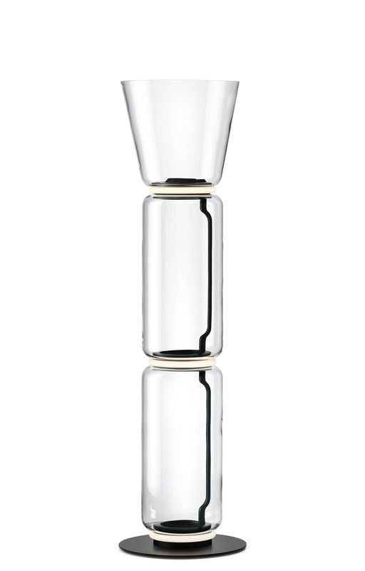 La collection de luminaires Noctambule, conçue par le réputé designer munichois Konstantin Grcic, est une ode à l'épure, à la rigueur fonctionnelle et à l'exploration de typologies inédites. Elle incarne l'art de la création lumineuse contemporaine. Chaque lampe Noctambule est un empilement de modules transparents en verre soufflé, façonnés artisanalement, maintenus par une structure interne en métal laqué noir. L'assemblage de formes géométriques essentielles, telles que le cylindre, le cône et le dôme, aboutit à des sculptures lumineuses équilibrées qui révèlent l'élégance discrète des matériaux.