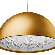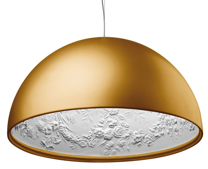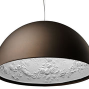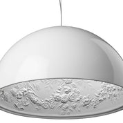 La suspension Skygarden est bien plus qu'un luminaire. Présentée pour la première fois au salon de Milan en 2007, elle est devenue une véritable icône du design, marquant l'alliance parfaite entre élégance minimaliste et fantaisie baroque. La grande coupole en aluminium noir brillant cache un intérieur somptueux en plâtre blanc orné de motifs moulurés et de guirlandes de fleurs. Ce mariage de simplicité et de décoration baroque crée une harmonie délicate et surprenante. Le diffuseur interne en verre opalin est enveloppé d'une dentelle baroque en acier inoxydable.