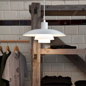 La suspension PH 4½/4 Verre fait partie de la famille PH 3-abat-jour, et le principe du luminaire PH 3-abat-jour a été réalisé durant les quelques mois mouvementés de l’hiver 1925-26 pour une grande halle d’exposition à Copenhague, au Danemark, appelée « Forum ». Voici ce que Poul Henningsen déclara à propos de ce nouveau luminaire en 1926 : « La véritable innovation du luminaire PH est qu’il produit un éclairage aussi bien sans éblouissement qu’économique.