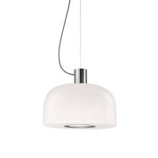 La suspension Bellhop Glass peut être utilisée comme lampe d'ambiance mais aussi comme lampe de travail, qui éclaire directement, avec un cône de lumière non aveuglant, la surface sur laquelle elle est suspendue. Le trou dans la partie inférieure de la lampe, protégé par un élément en aluminium, est façonné pour diriger la lumière (et changer l'ampoule) en évitant la diffusion jusqu'aux yeux de ceux qui sont assis à la table. Un cône de lumière est donc créé à l'intérieur de la suspension Bellhop Glass, qui se dilate de manière homogène dans l'environnement sur tous les côtés et se pose précisément sur la table, comme une torche, signalée visuellement par l'anneau en aluminium coloré qui entoure l'ouverture inférieure de la lampe.