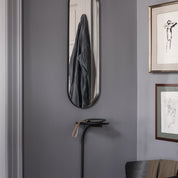 Les lignes élégantes et la forme simple se rencontrent dans un magnifique miroir ovale avec un cadre en métal peint par poudrage noir. Sa forme oblongue explore les dimensions du cercle et trace une ligne droite à notre langage de conception géométrique unique. La cheville en bois noire incluse complète la silhouette stricte avec une touche de finition naturelle.