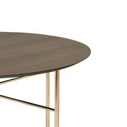 Dans un jeu élégant et contemporain de couleurs, de contrastes et de textures, ce plateau rond est réalisé en placage de chêne avec une base en MDF sur pied en laiton.