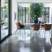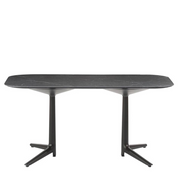 Multiplo est une très large collection de tables, aux applications transversales, pensées pour être personnalisées, en jouant sur les formes (carrées aux coins arrondis, rondes et ovales) et la combinaison de piètements (piètement central, à deux, trois ou quatre branches) et de plateaux (en grès uni ou finition marbre et verre).