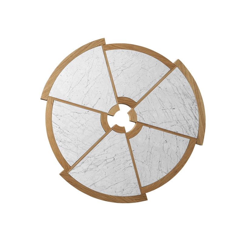 Cette spectaculaire table basse se compose de six sections aux rayons variés, fabriquées en marbre Marquiña ou en rotin, avec un bord extérieur en chêne teinté. Ses six pieds, conçus dans le même bois, soutiennent harmonieusement la structure.