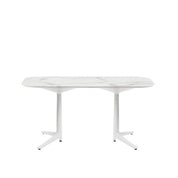 Multiplo est une très large collection de tables, aux applications transversales, pensées pour être personnalisées, en jouant sur les formes (carrées aux coins arrondis, rondes et ovales) et la combinaison de piètements (piètement central, à deux, trois ou quatre branches) et de plateaux (en grès uni ou finition marbre et verre).