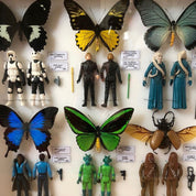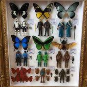Réalisés dans un atelier parisien à partir de véritables pièces d'entomologie et de figurines vintage adaptées de la saga Star Wars, ces coffrets associent coléoptères ou papillons d'élevage venus des quatres coins du globe (Thaïlande, Cameroun, Indonésie, Philippines) et personnages édités par la marque Kenner de 1977 à 1985.