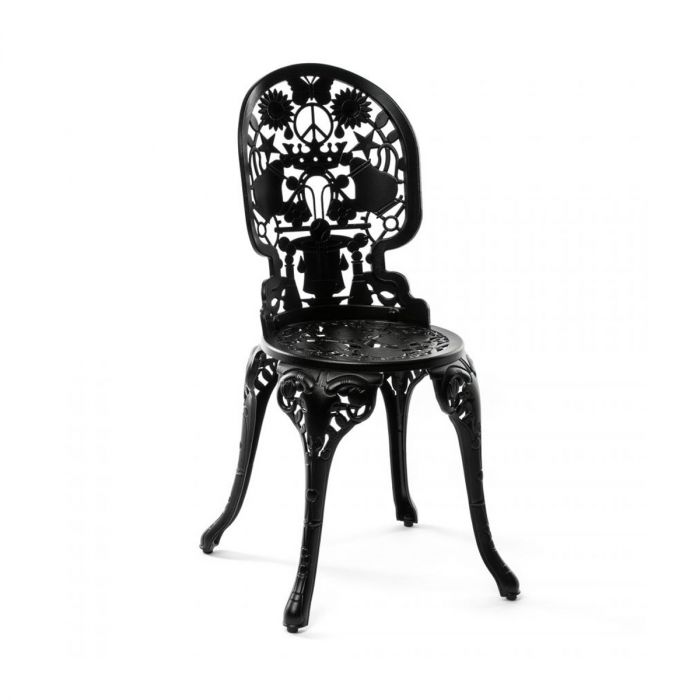 Industry Garden est une collection rock’n roll, barrée et baroque à la fois, que Studio job a imaginée pour Seletti. Les chaises, fauteuils et tables de la gamme sont entièrement réalisés en fonte d’aluminium laqué époxy. Déclinés en plusieurs coloris et sublimés par une finition mate, les différents éléments se marient et s’associent à l’envi, selon que l’on veuille un ensemble de jardin uniforme ou polychrome. L’aspect sculptural de chaque modèle - stylisé de haut en bas et avec un rare sens du détail - lui confère son élégance. On aime les motifs volontairement kitsch (fleurs, papillons, coeurs ou logos 'peace and love') qui apparaissent dans la dentelle métallique de chaque modèle.