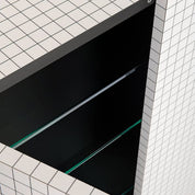 Placage interne en stratifié noir. 3 étagères intérieures orientables en verre trempé épaisseur 10 mm.