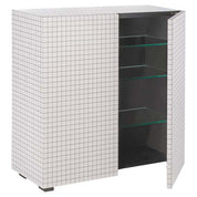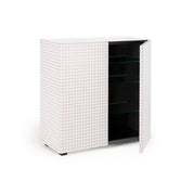 Il a une structure en bois stratifié Print blanc, imprimé numériquement avec des carrés noirs avec un espacement de 3 cm.