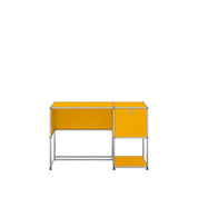 Ce bureau est équipé de deux espaces de rangement à droite, dont un ouvert et un fermé par une porte abattante avec poignée sans serrure. Ses panneaux colorés se déclinent dans une palette de 14 couleurs.