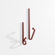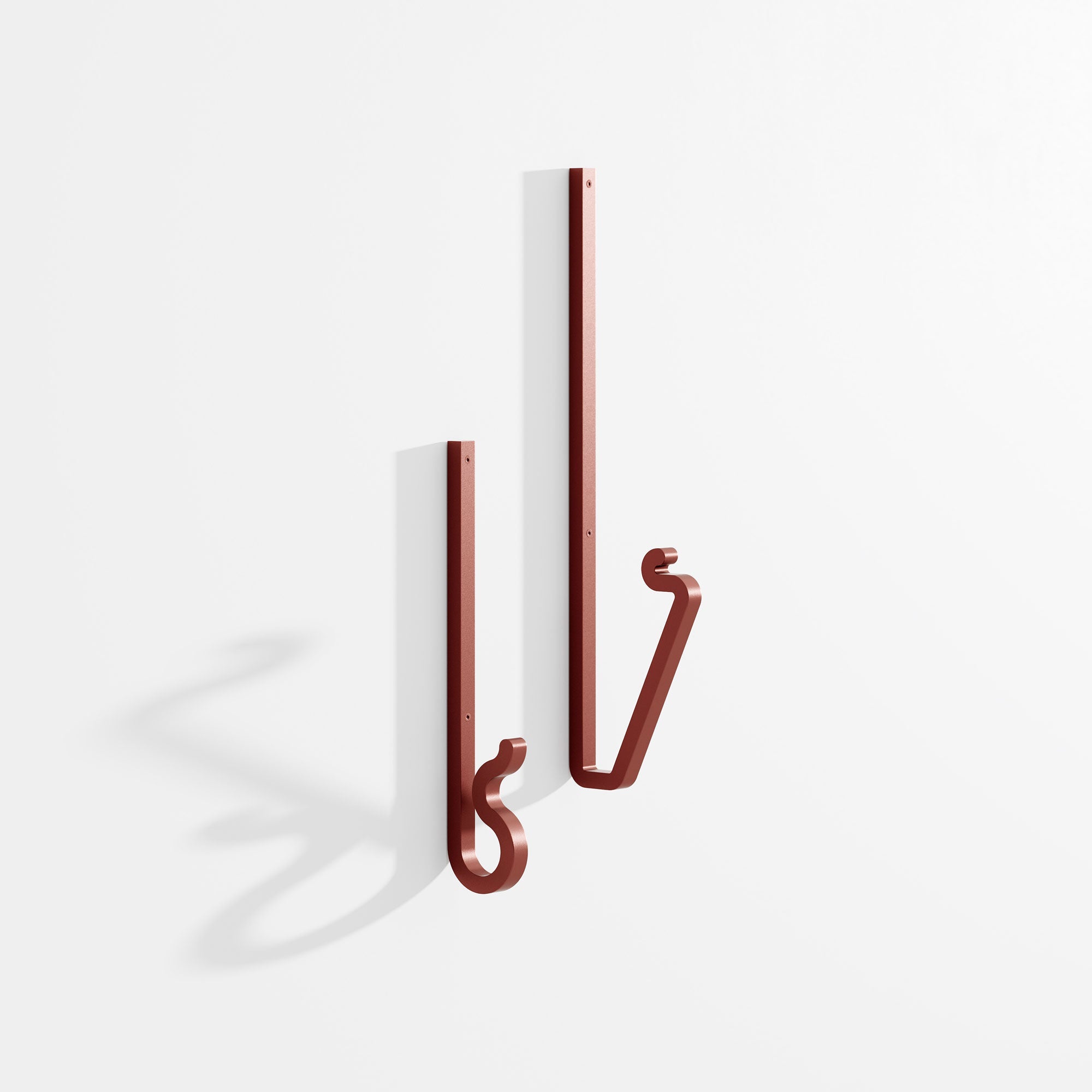 Red Coat Hooks - Small: H 25.5 x Depth. 5 cm, thickness 1 cm - Large: H 36.3 cm x Depth. 9 cm, thickness 1 cm