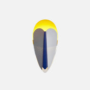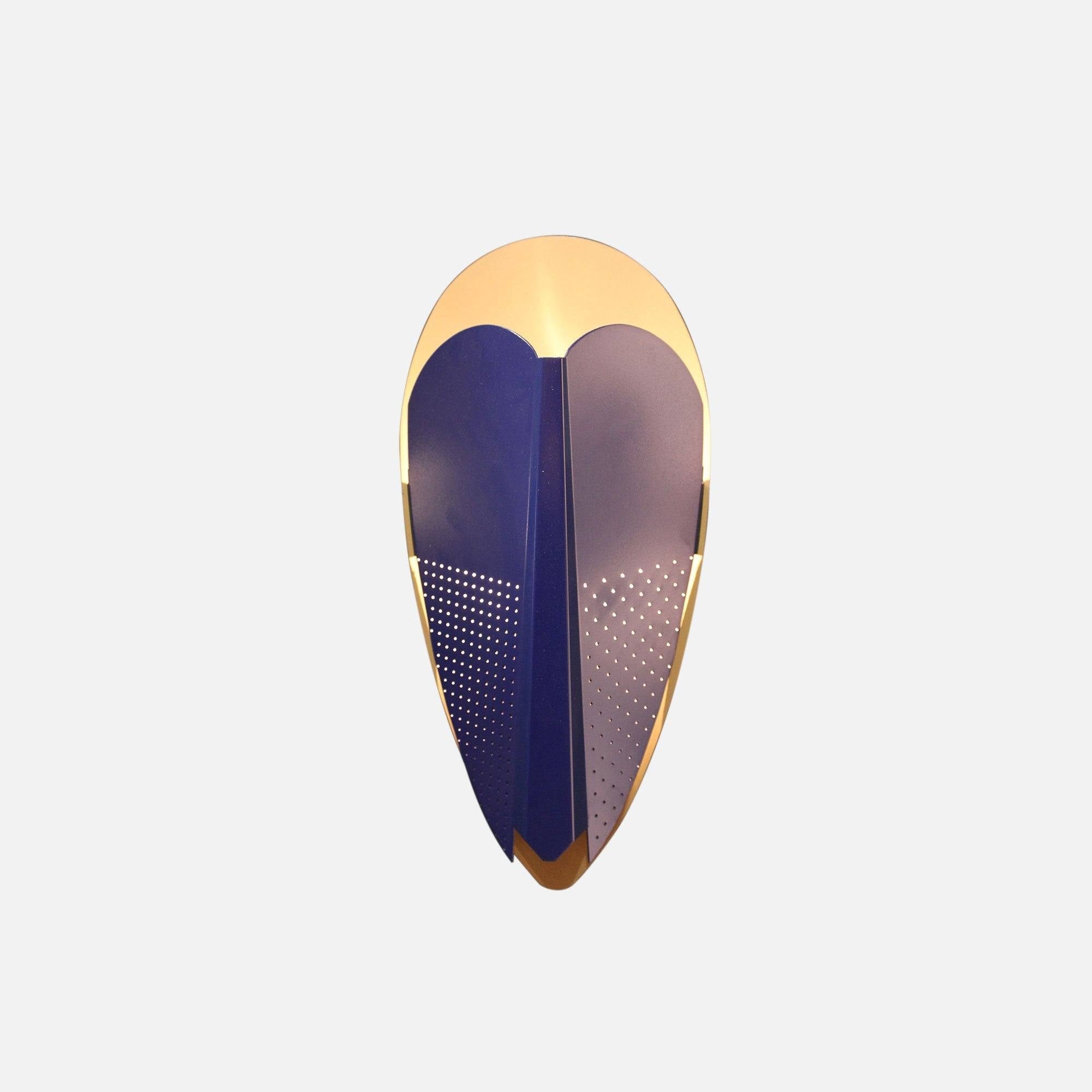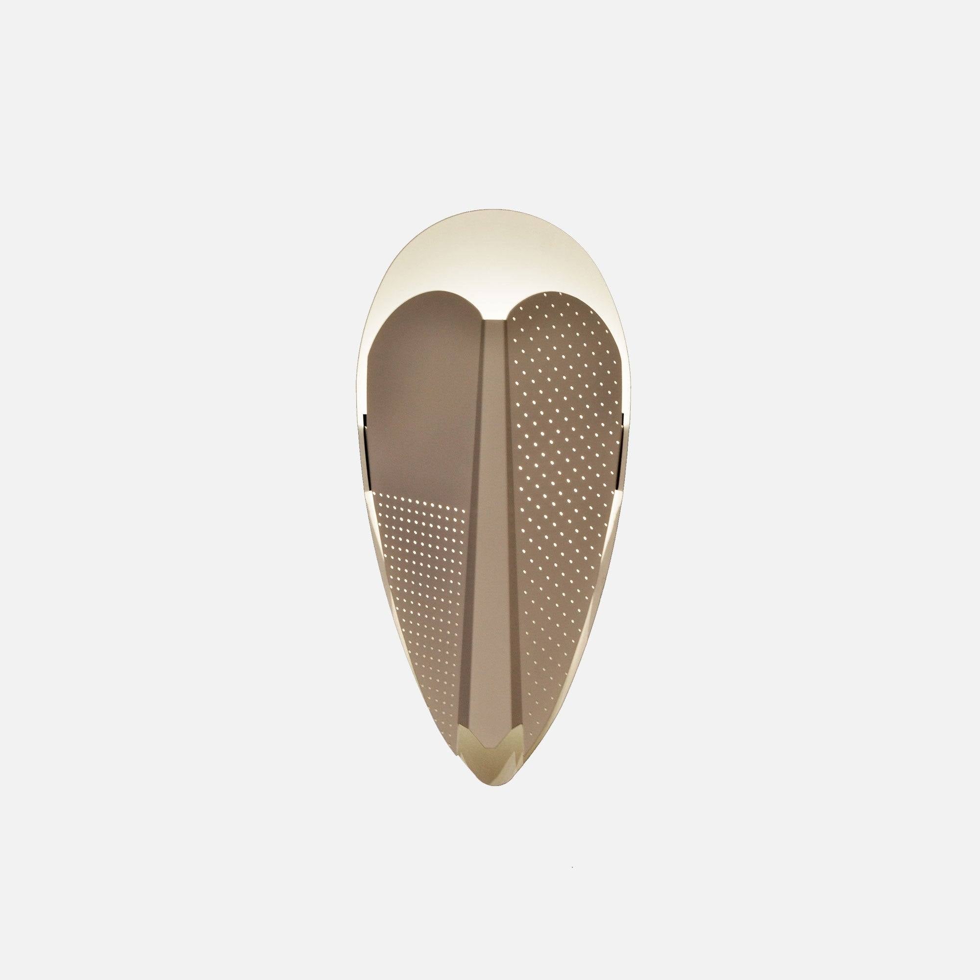 Sorcier is a wall light inspired by the Ngil ritual masks of the Fang tribe in Gabon. The light diffuses through the perforations of the mask and radiates upwards in a graphic and soft way. It changes personality depending on the combination of colors, textures and perforated patterns, which vary in each version.