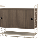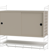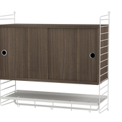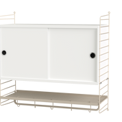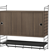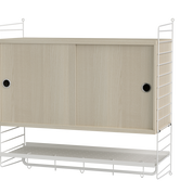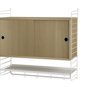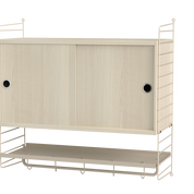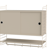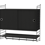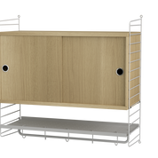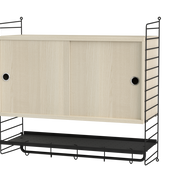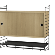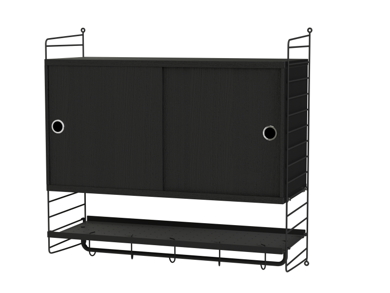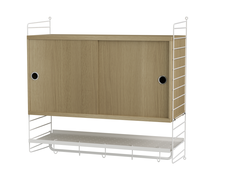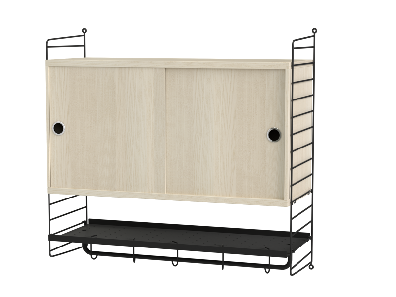 Here, String offers an ideal wall combination for storing your accessories. The sliding door box allows you to store your small personal effects such as jewelry, cufflinks, etc. The bar allows you to store your scarves or scarves. While the hooks allow you to store your necklaces but also your scarves. The small metal shelf allows you to quickly access certain objects while keeping a tidy appearance. the sober and elegant design of the string modules allows them to easily integrate into your interior.