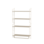The String range has been enriched over the years: the shelves and metal uprights have been available in various colors and equipped with new accessories (newspaper racks, folding tables, cabinets with sliding doors, shelves with containers or desk trays).