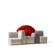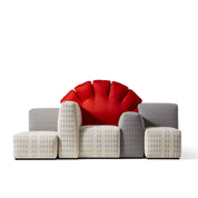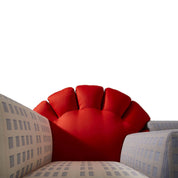 Inspired by Pop Art, the sofa combines upholstered skyscrapers with an exclusive rectangular textured fabric, creating an effect of light and shadow, and a setting sun in bright red satin, symbolizing the beating heart of the city.