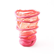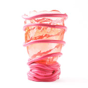 The Pompitu I vase, created by Gaetano Pesce for the 1995 Fish Design collection at Corsi Design, embodies a vibrant and distinctive lifestyle. This cast resin vase reveals Pesce's ingenious spirit with its vibrant colors and organic shapes, adding vitality and dynamism to any space. The Pompitu I is characterized by a translucent layer of light ruby ​​enveloped by a bright fuchsia-colored rope that elegantly wraps around the vase.