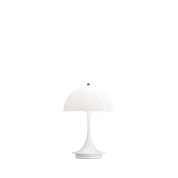 The Panthella 160 Portable Lamp, designed by Danish designer Verner Panton and produced by Louis Poulsen, is a modern and portable reinterpretation of the famous original Panthella lamp from 1971. With a hemispherical lampshade of only 160 mm in diameter, this lamp combines aesthetic and functionality, directing light downward onto its trumpet-shaped base, which reflects light evenly. It is available in a variety of colors, such as Black, White Opal Acrylic, Gray Opal Acrylic, Orange, White, Pale Blue, Coral and Pale Pink, and is made of white opal acrylic and plastic. Its dimensions are L ø 160 mm x W ø 106 mm x H 238 mm, making the lamp ideal for domestic or portable use.
