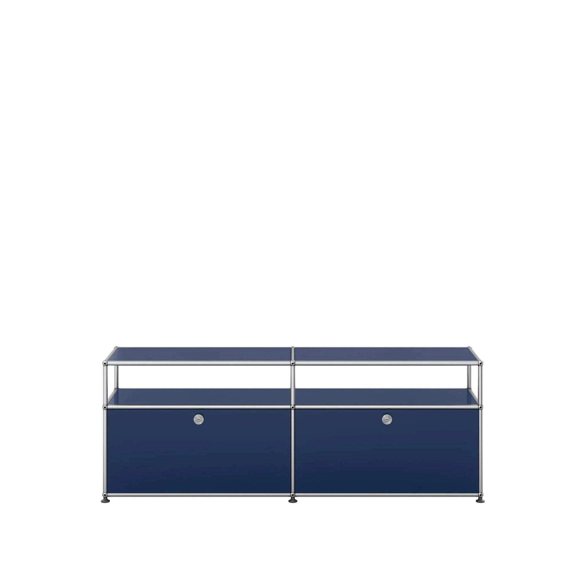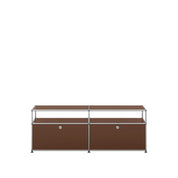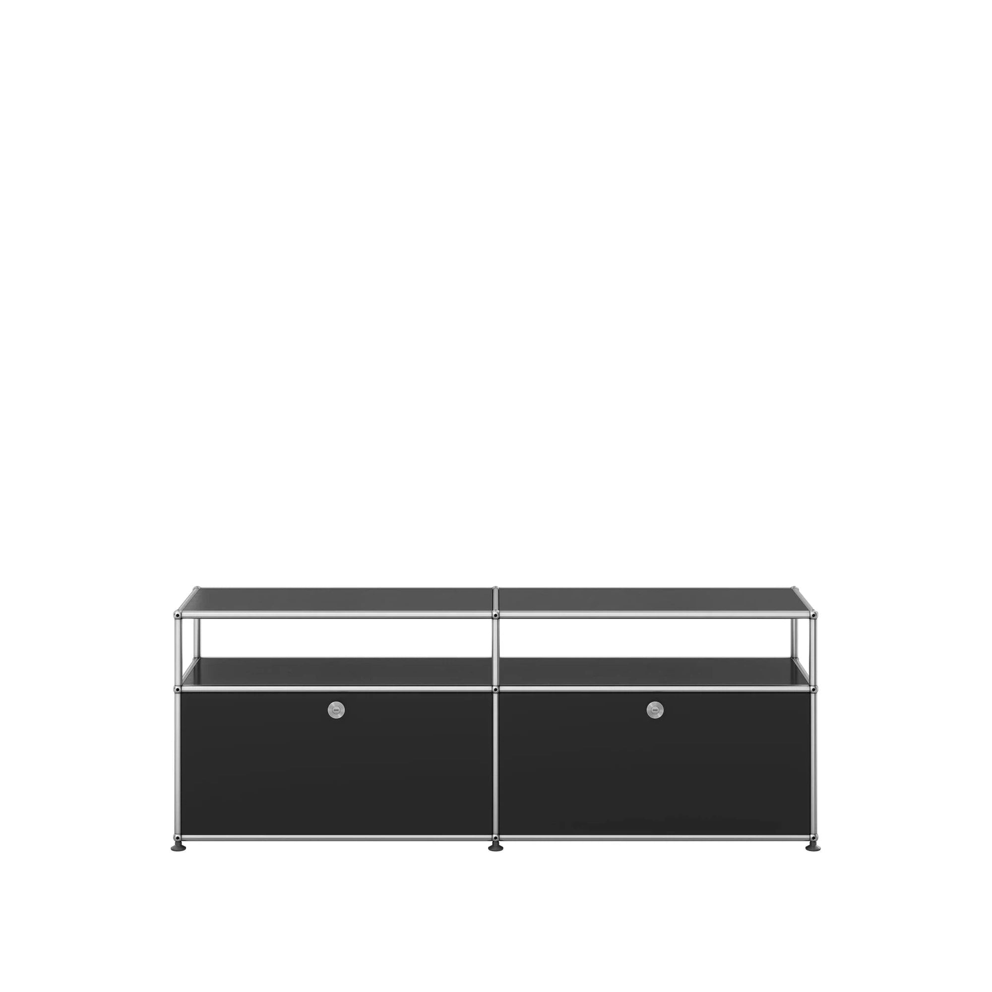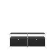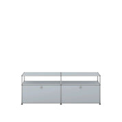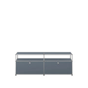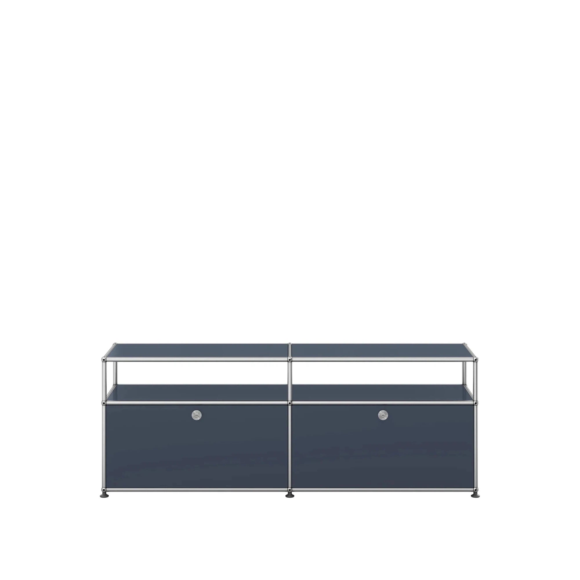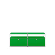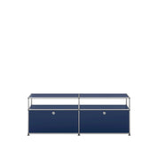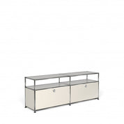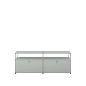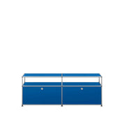 The USM O2 cabinet is made up of two drop-down doors and two open modules. It has a chrome steel structure assembled by connection balls, covered with powder-coated steel panels and mounted on height-adjustable glides.