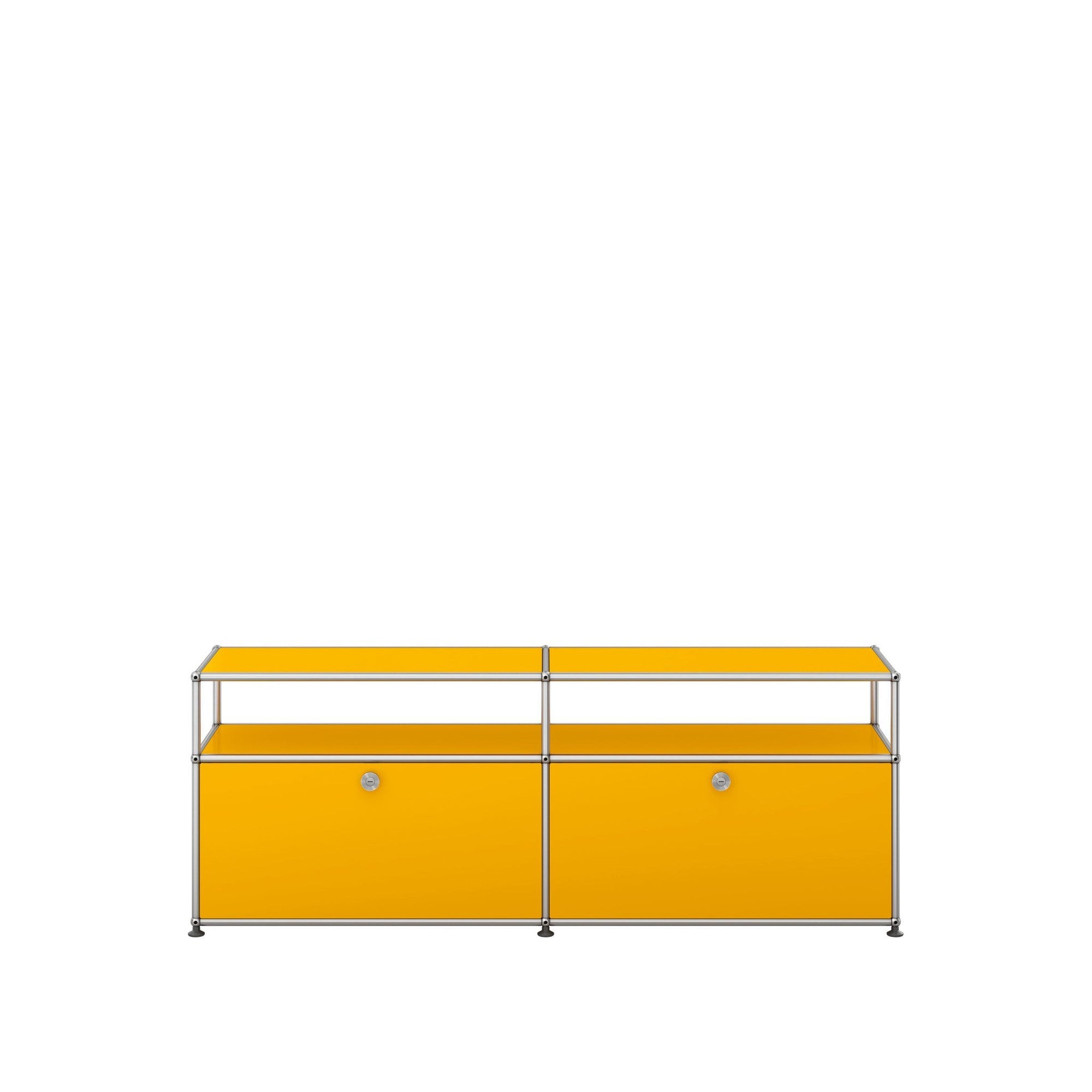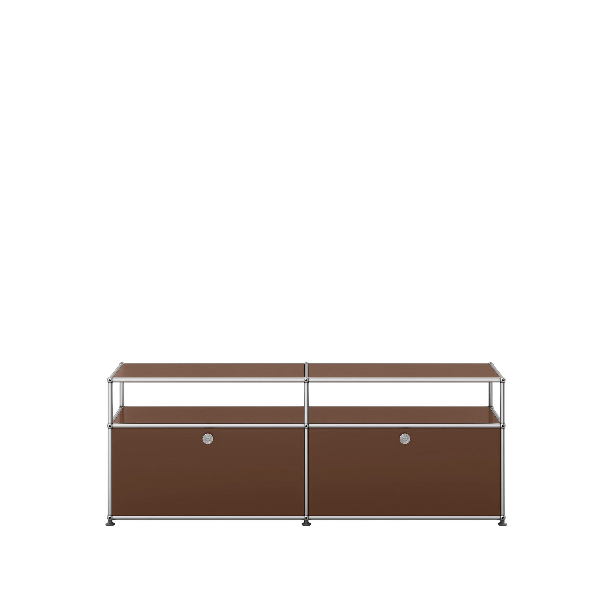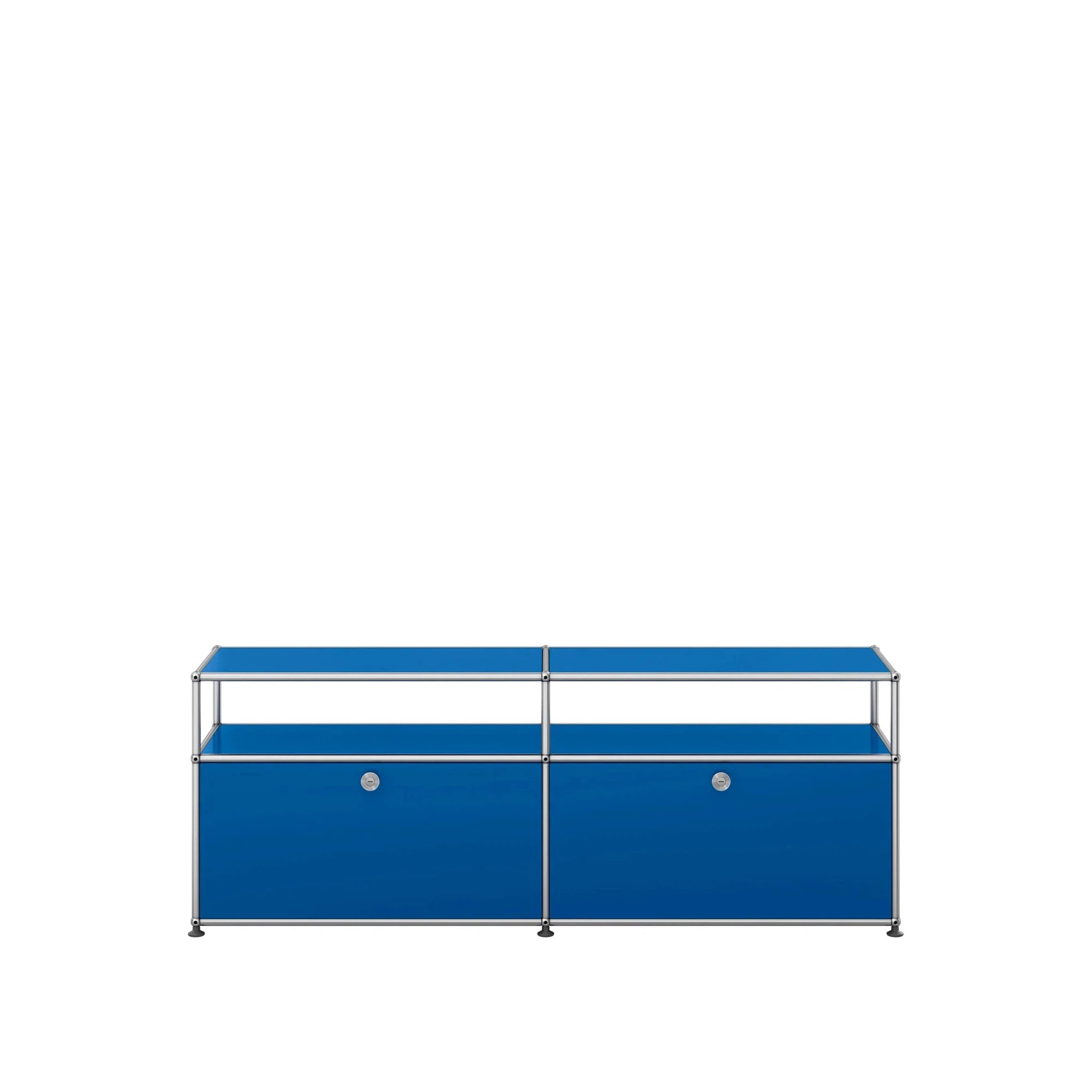 The USM O2 cabinet is made up of two drop-down doors and two open modules. It has a chrome steel structure assembled by connection balls, covered with powder-coated steel panels and mounted on height-adjustable glides.
