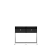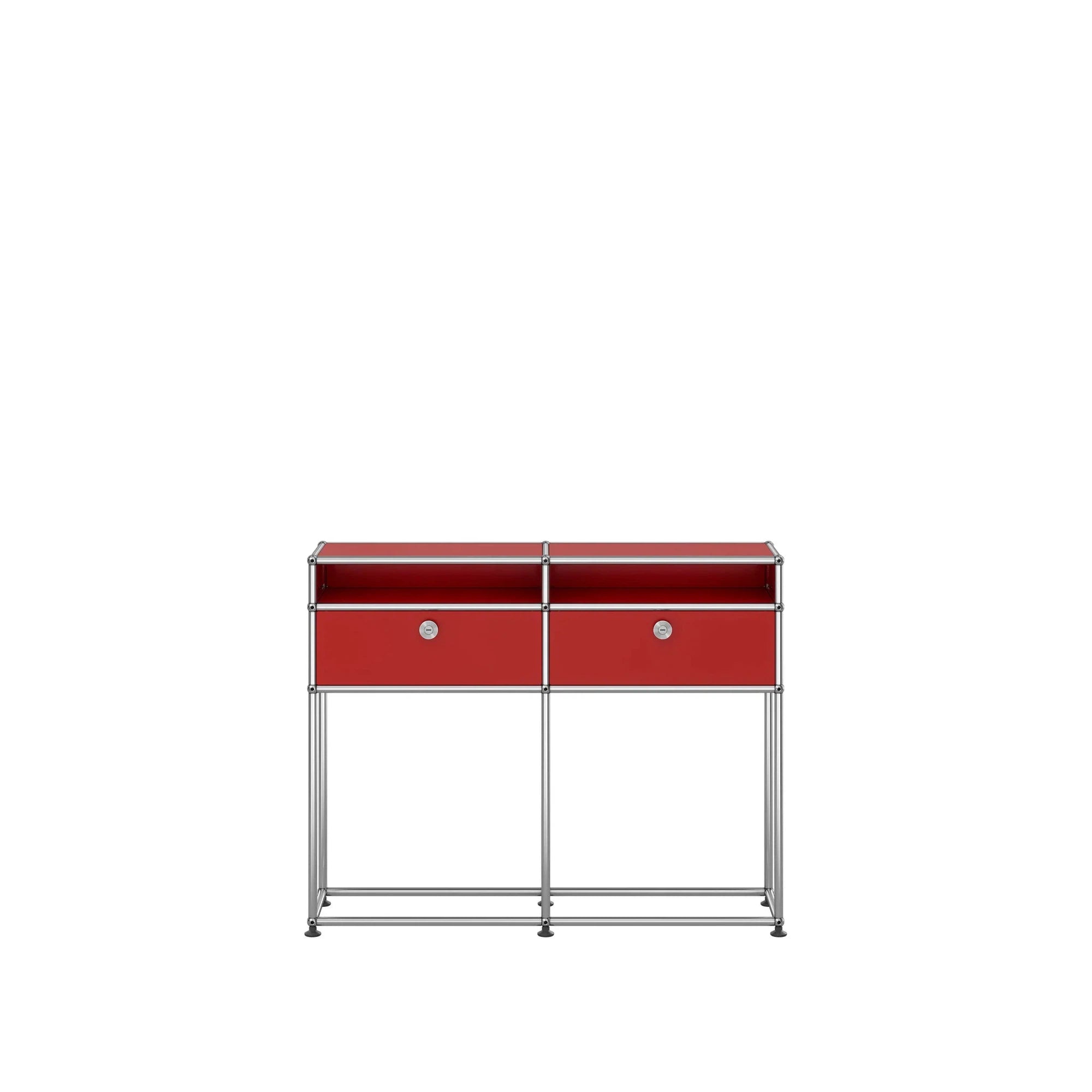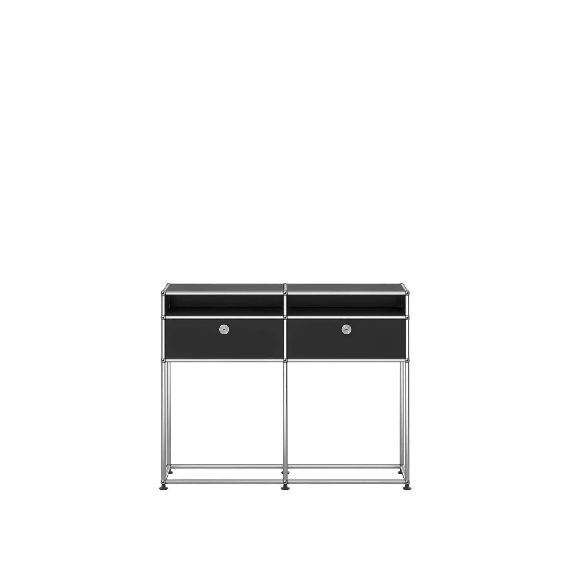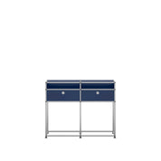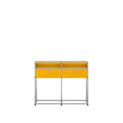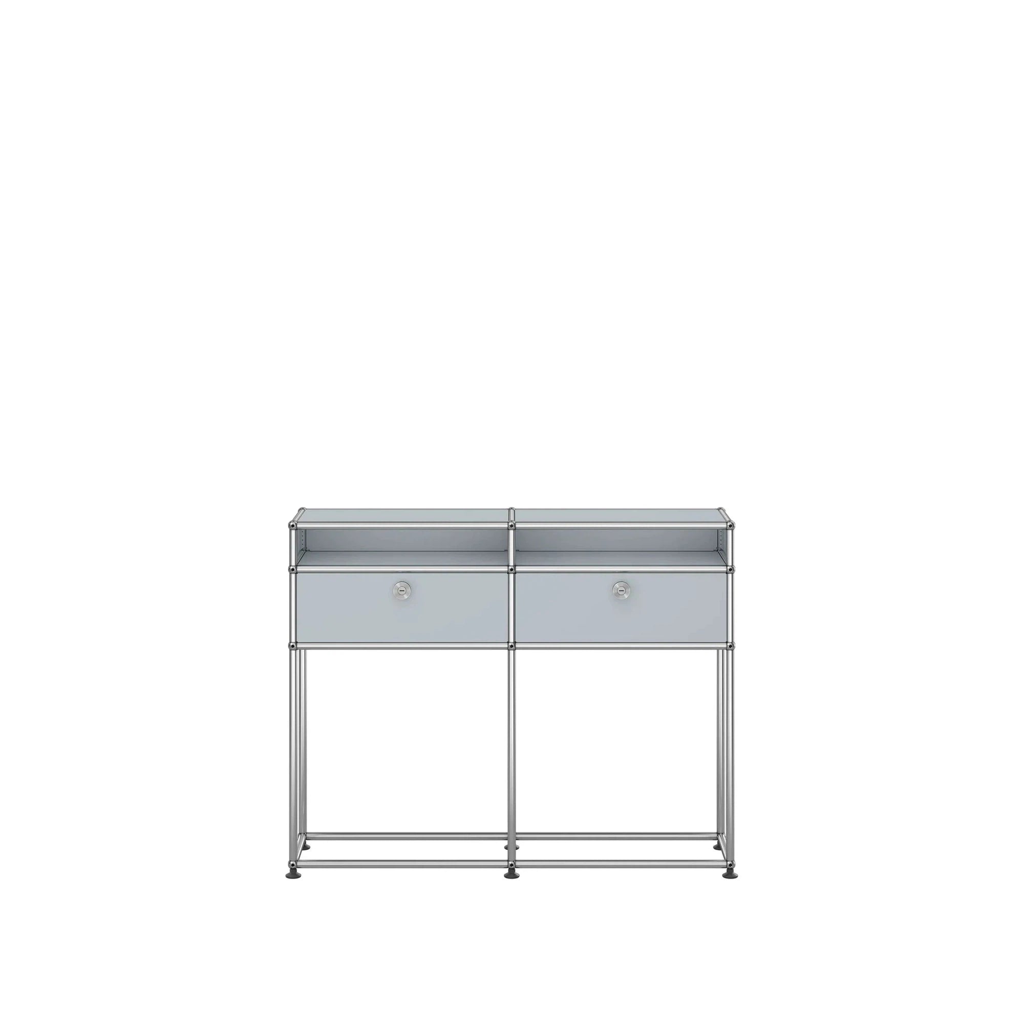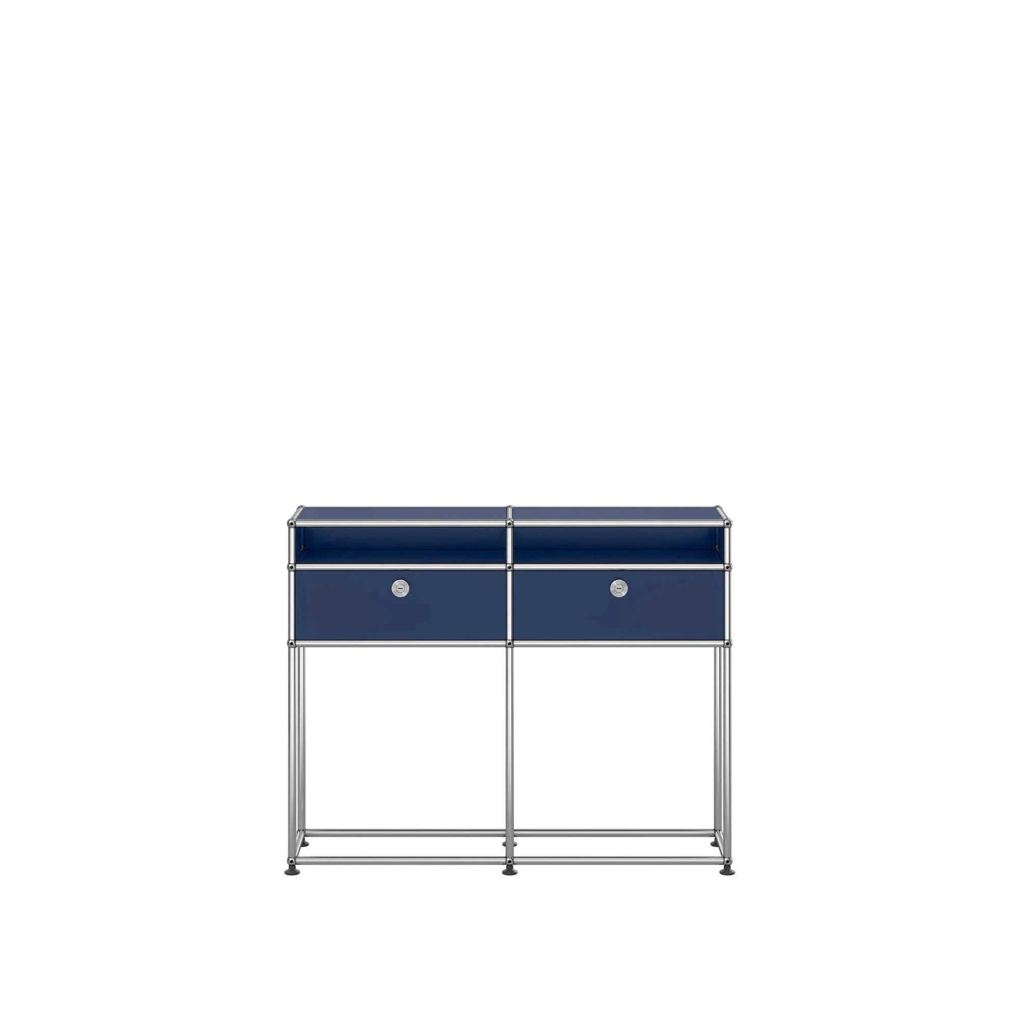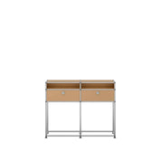 The Haller M51 console is made up of two drop-down doors. It has a chrome steel structure assembled by connection balls, covered with powder-coated steel panels and mounted on height-adjustable glides. It also has a wall anchor set.