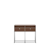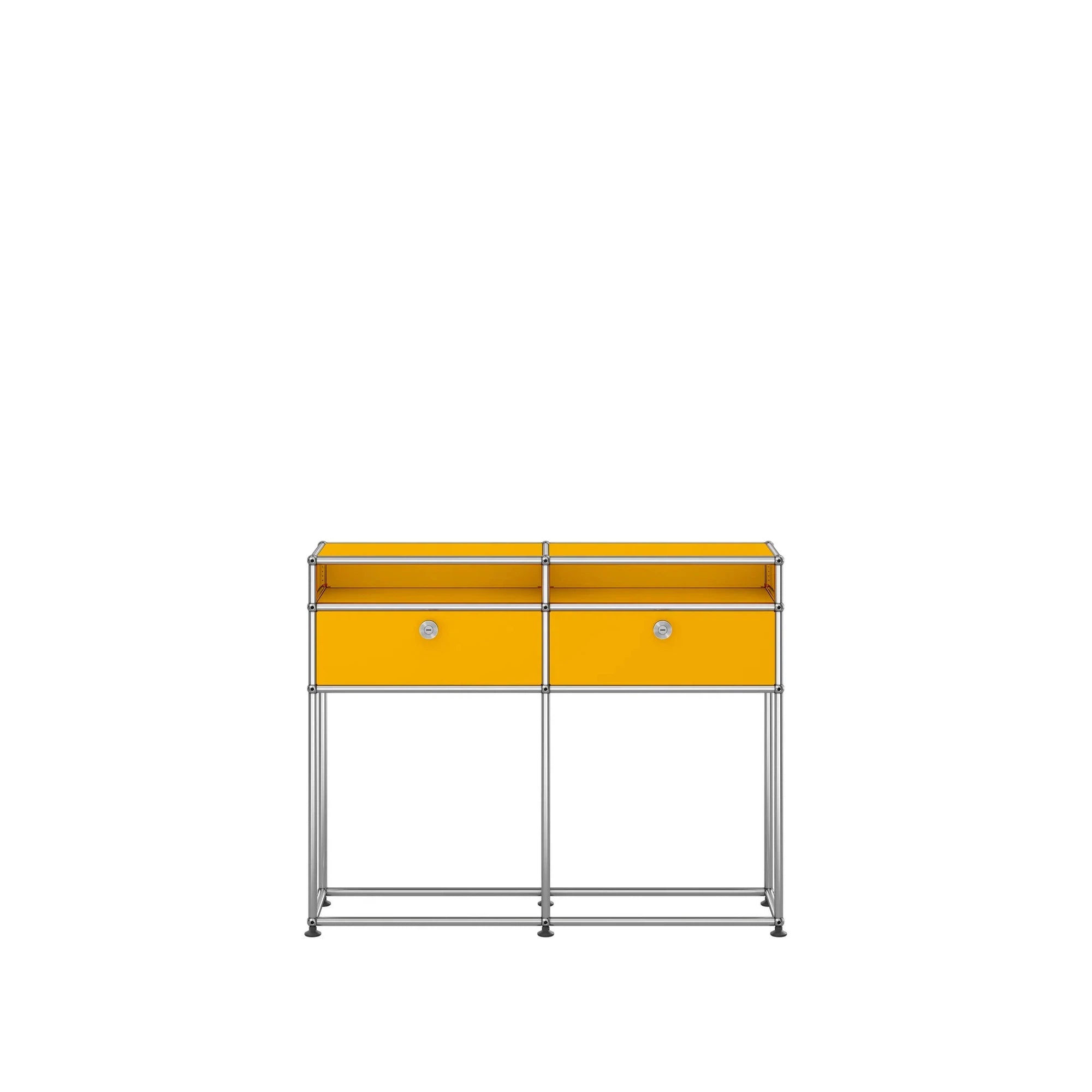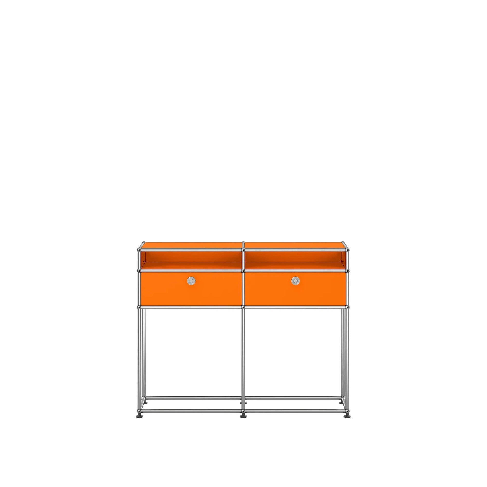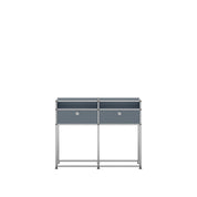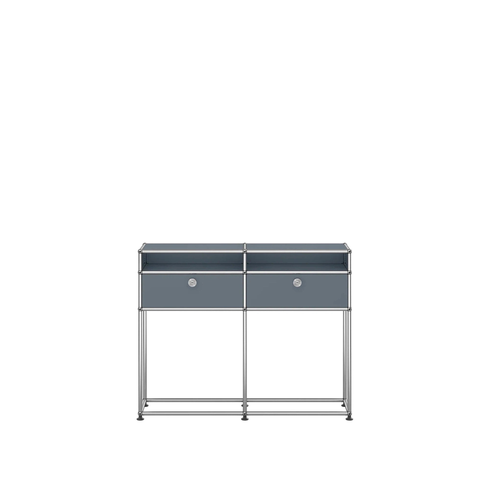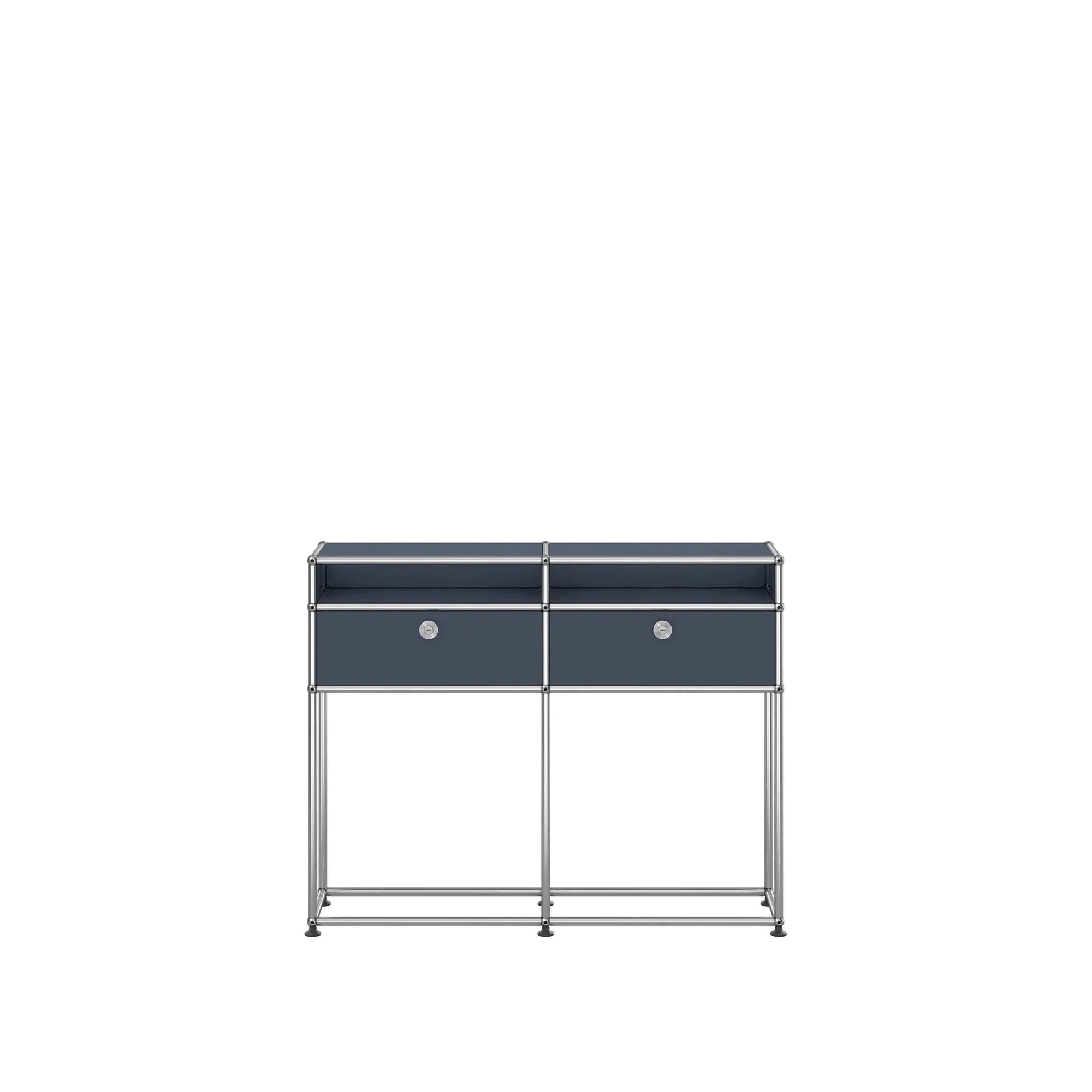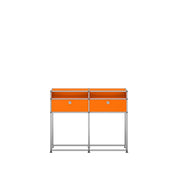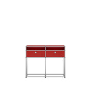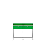 The Haller M51 console is made up of two drop-down doors. It has a chrome steel structure assembled by connection balls, covered with powder-coated steel panels and mounted on height-adjustable glides. It also has a wall anchor set.