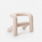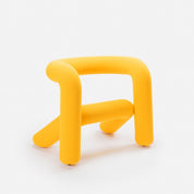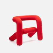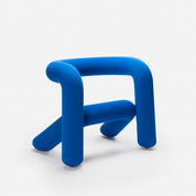 Contrary to what it suggests, this radical armchair offers surprising comfort. Taking up the plastic principles of the Bold collection, it combines two tubes generously inflated with thick polyurethane foam. The two identical tubular parts are nested one inside the other. An invisible assembly system allows the seat and backrest to fit flush, which barely seem to touch each other when assembled.