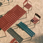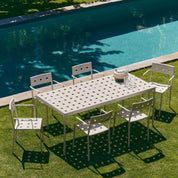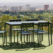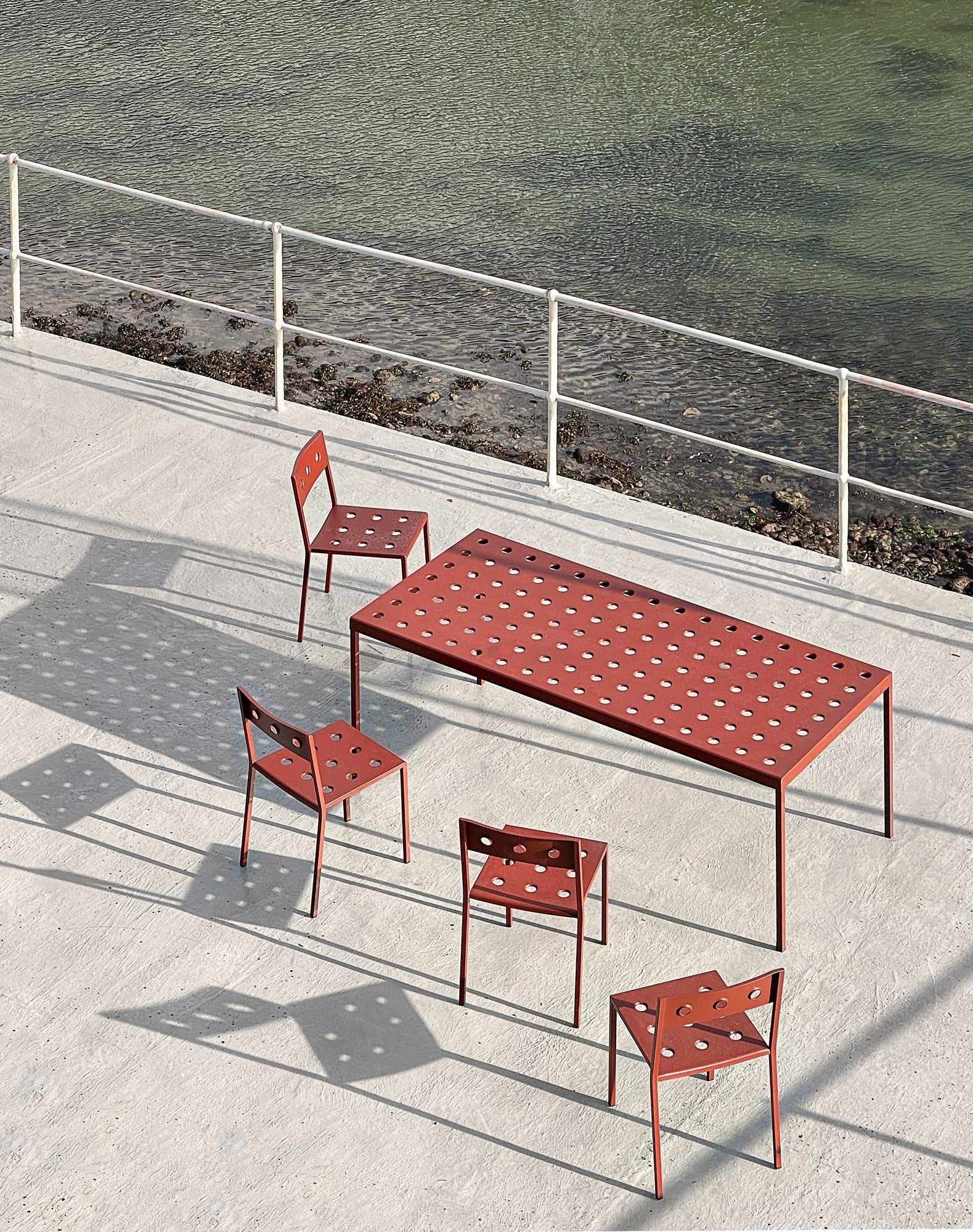 Designed for HAY by Ronan and Erwan Bouroullec, the Balcony Table is an elegant outdoor dining table. The simple rectangular design is softened by slim legs, the multiple holes on the table surface reinforcing the construction, while creating a distinct expression. Made from powder-coated steel with an outdoor primer for optimal strength and durability, Balcony is available in a number of different colors and sizes, making it a versatile table that can be used in all types of spaces, from small balconies and terraces to gardens and other larger outdoor spaces.