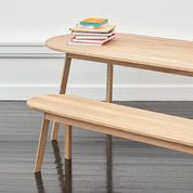In order to optimize the number of seats, the rectangular ends of the table and bench have been softened.