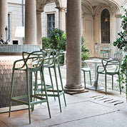 Discover the Masters Stool, the stool interpretation of the famous Masters chair. Signed by designers Eugeni Quitllet and Philippe Starck, it offers a unique silhouette. The meeting of the lines of three iconic chairs gives life to a distinctive graphic backsplash. Suitable for modern interiors as well as outdoor spaces.