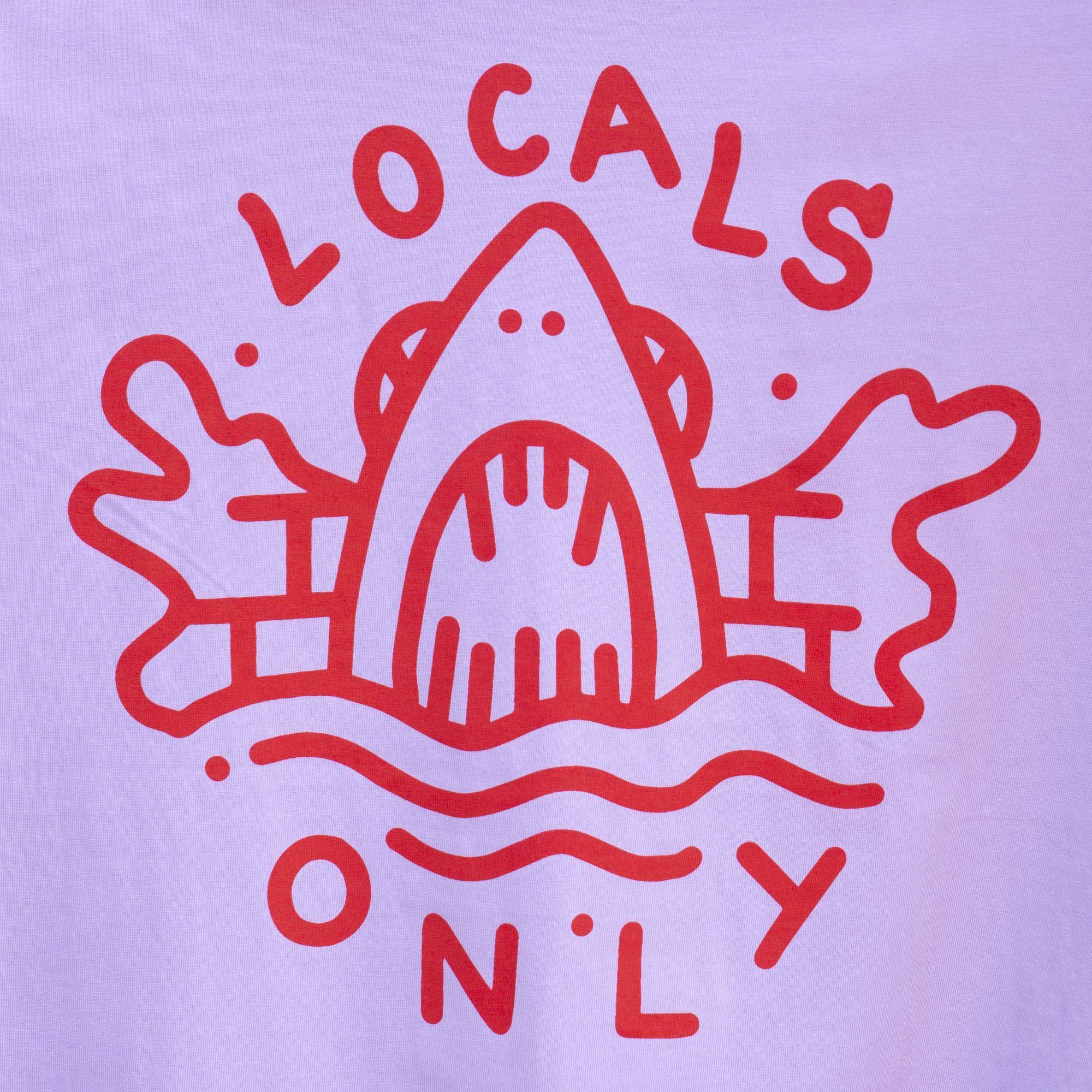 Exclusive original drawing by Fuzi in screen printing on the front of the t-shirt, heart location, representing the jaws of a shark and the LOCALS ONLY typography. On the back of the t-shirt, large format LOCALS ONLY screen printing and shark.