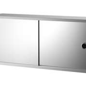 Cabinet with 2 sliding mirror doors suitable for String System uprights with a depth of 30 cm. Inside a removable glass shelf.