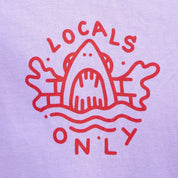 Exclusive original drawing by Fuzi in screen printing on the front of the t-shirt, heart location, representing the jaws of a shark and the LOCALS ONLY typography. On the back of the t-shirt, large format LOCALS ONLY screen printing and shark.