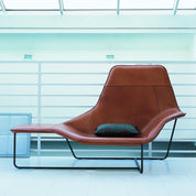 • Materials: Graphite-colored painted steel structure, self-extinguishing polyurethane foam padding, light brown leather covering