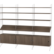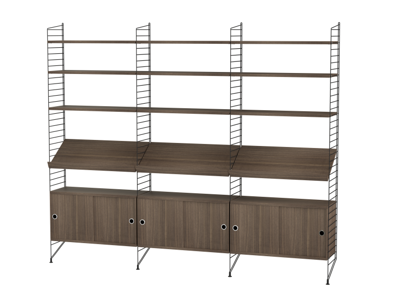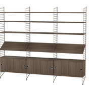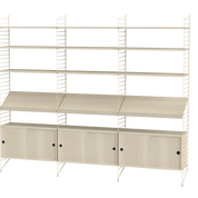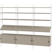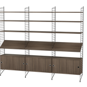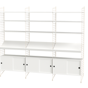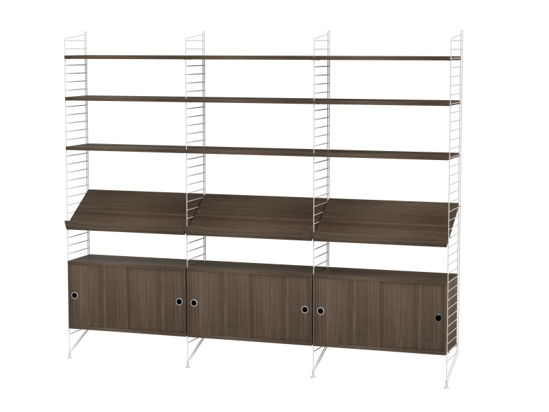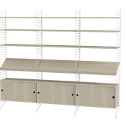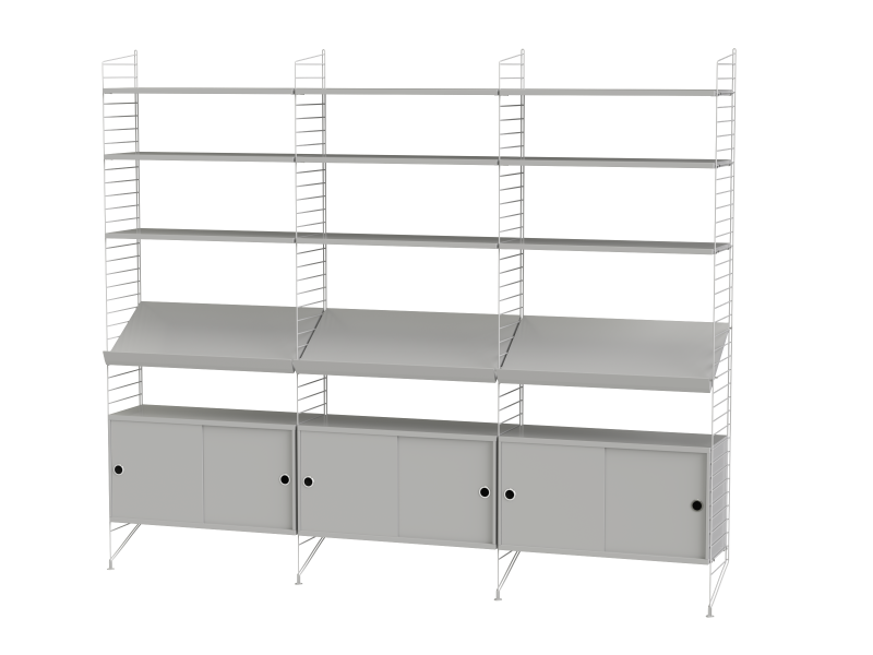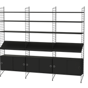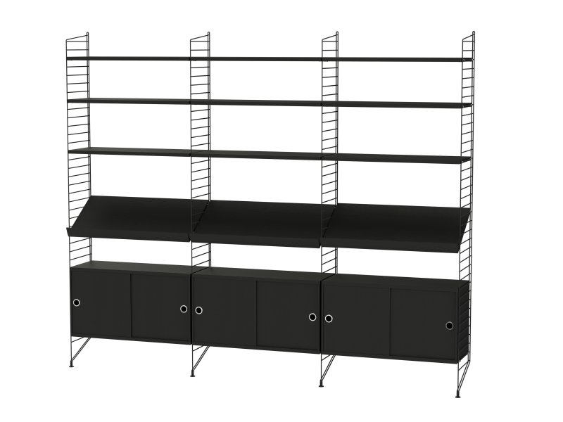 The String range has been enriched over the years: the metal shelves and uprights have been available in various colors and equipped with new accessories (newspaper racks, folding tables, cabinets with sliding doors, shelves with containers or desk trays).