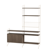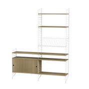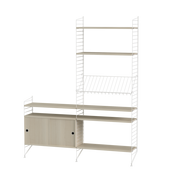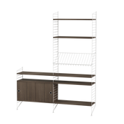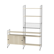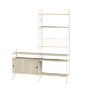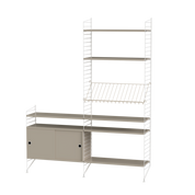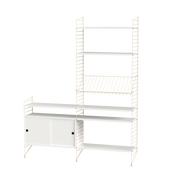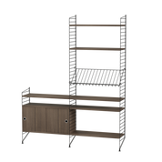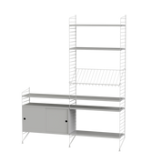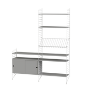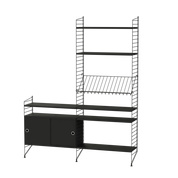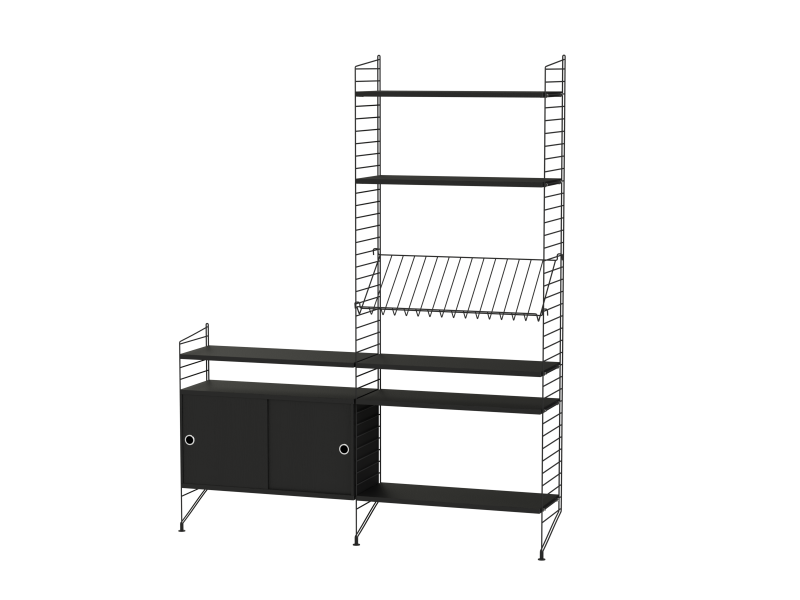 The String range has been enriched over the years: the shelves and metal uprights have been available in various colors and equipped with new accessories (newspaper racks, folding tables, cabinets with sliding doors, shelves with containers or desk trays).