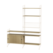 The STRING system is made up of two metal uprights (beige, white, gray, black or metal) on which you simply insert wooden shelves (beige, white, gray, black stained ash, ash, oak or walnut).