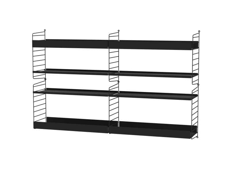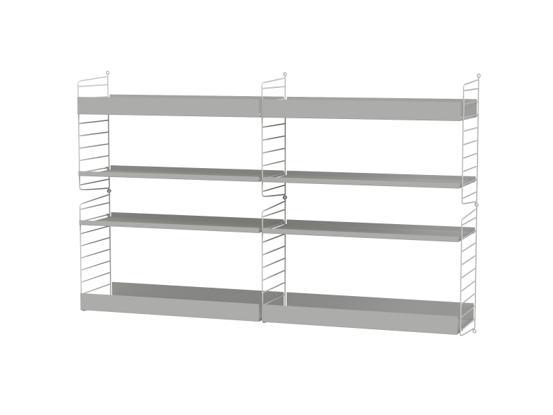 The String range has been enriched over the years: the shelves and metal uprights have been available in various colors and equipped with new accessories (newspaper racks, folding tables, cabinets with sliding doors, shelves with containers or desk trays).
