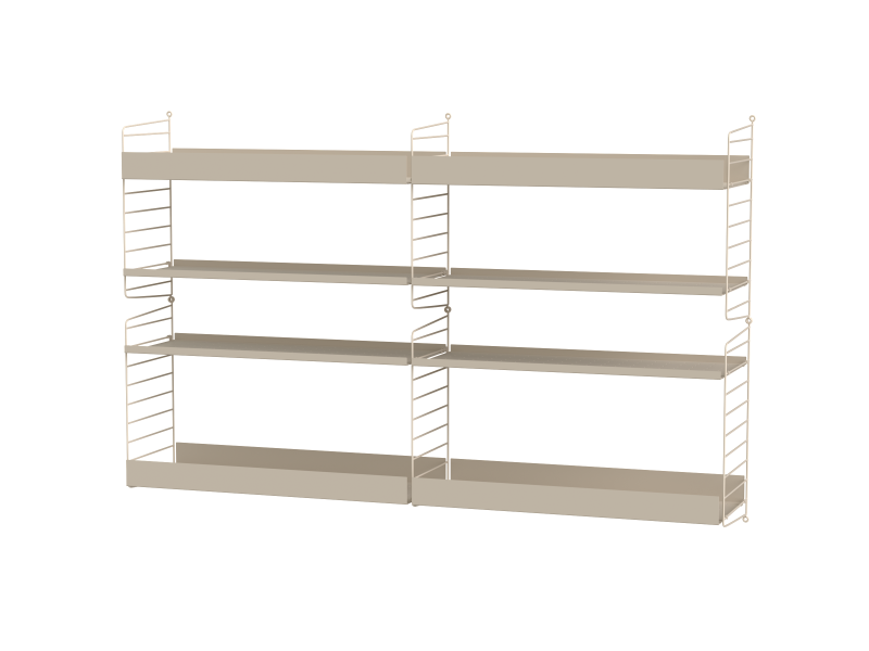 The STRING system is made up of two metal uprights (beige, white, gray, black or metal) on which you simply insert wooden shelves (beige, white, gray, black stained ash, ash, oak or walnut).