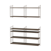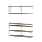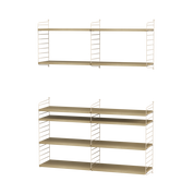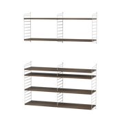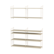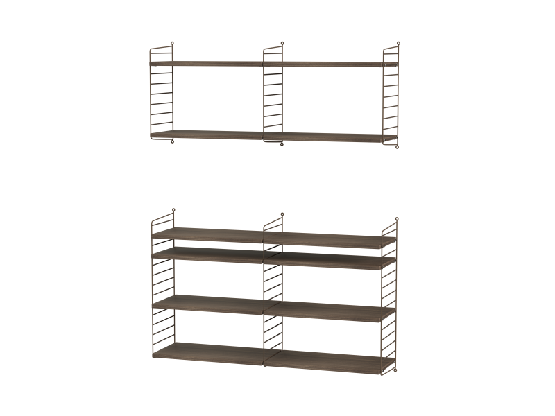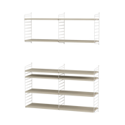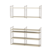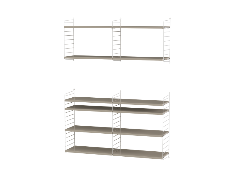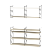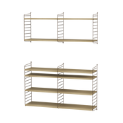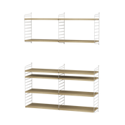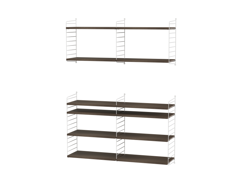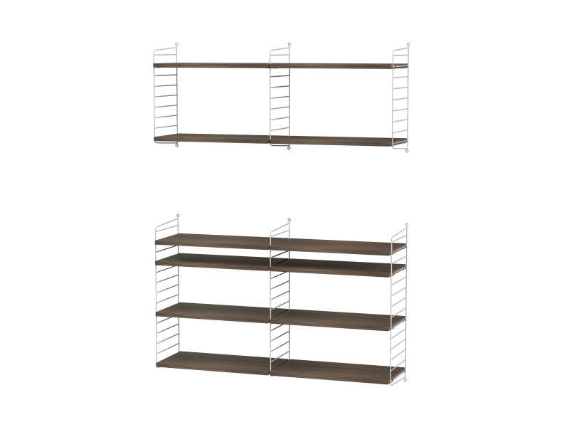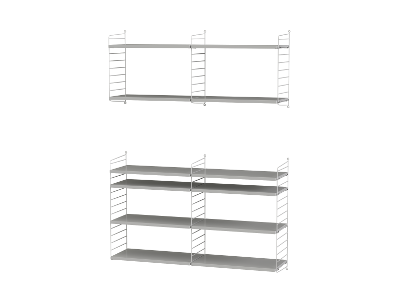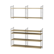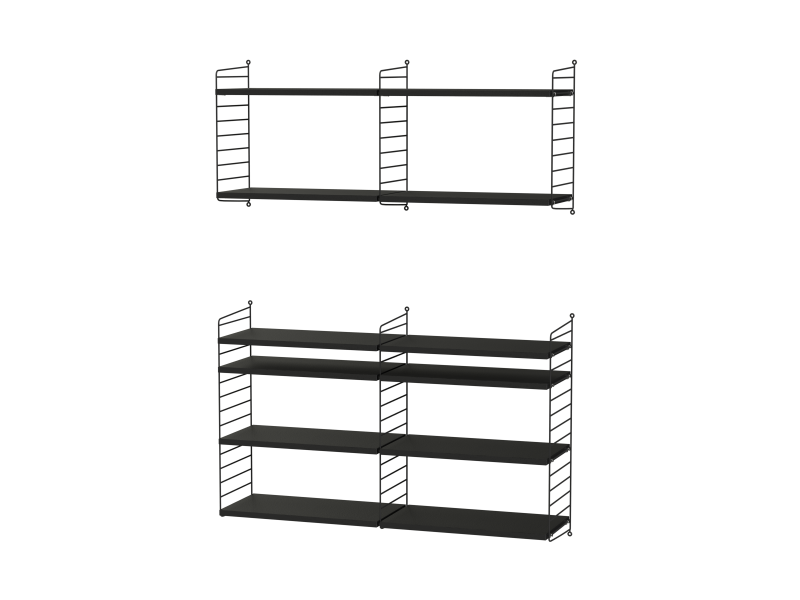 The STRING system is made up of two metal uprights (beige, white, gray, black or metal) on which you simply insert wooden shelves (beige, white, gray, black stained ash, ash, oak or walnut).