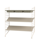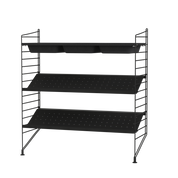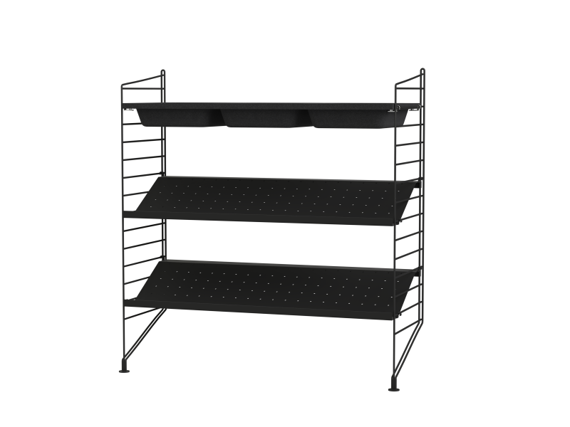 The String range has been enriched over the years: the shelves and metal uprights have been available in various colors and equipped with new accessories (newspaper racks, folding tables, cabinets with sliding doors, shelves with containers or desk trays).