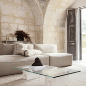 A harmonious marriage of natural materials and contrasting finishes, our mineral coffee table highlights the intrinsic beauty of stone and glass. The smooth, rectangular glass top is set on a base of two stone blocks - each with an unfinished end for a raw, textured look.